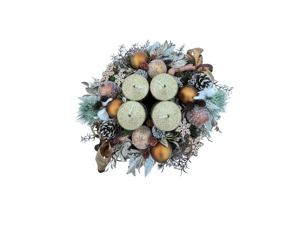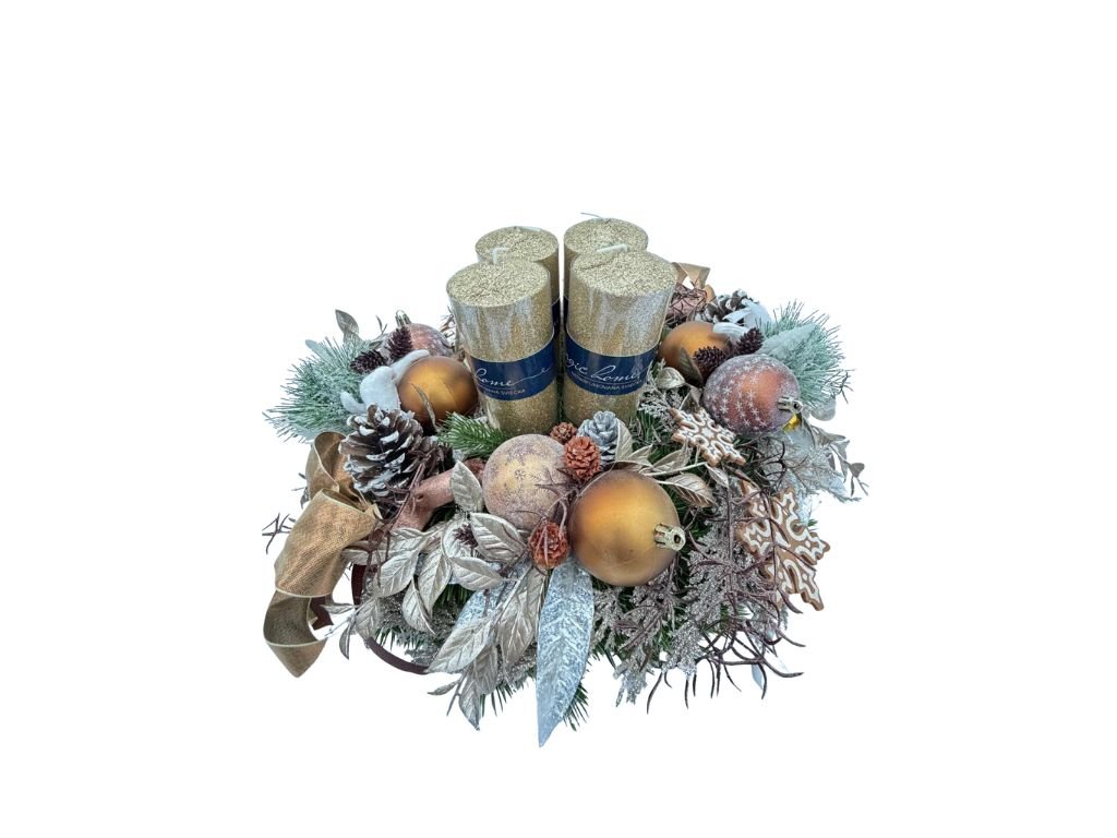 Tento luxusný adventný veniec v zlatej a prírodnej farebnej kombinácii pôsobí elegantne, teplo a slávnostne. Dominantou sú štyri zlaté trblietavé sviečky rovnomerne rozložené v strede, ktoré krásne vynikajú na bohatom zimnom aranžmáne. Výzdobu tvoria kombinácie zasnežených ihličnatých vetvičiek, veľké matné aj lesklé zlaté gule, šišky v bielej a bronzovej farbe, drobné vetvičky, prírodné plody a zlaté mašle. Nechýbajú ani jemne zdobené dekorácie v tvare vločiek, ktoré dodávajú vencu typickú zimnú atmosféru. Prírodné tóny ihličia a biele akcenty vytvárajú krásny kontrast k teplému zlatému lesku. Veniec pôsobí elegantne, štýlovo a veľmi sviatočne – ideálny doplnok na adventný stôl či do obývačky, kde okamžite vyzdvihne náladu blížiacich sa Vianoc. Hodí sa do moderného, rustikálneho aj tradičného interiéru.