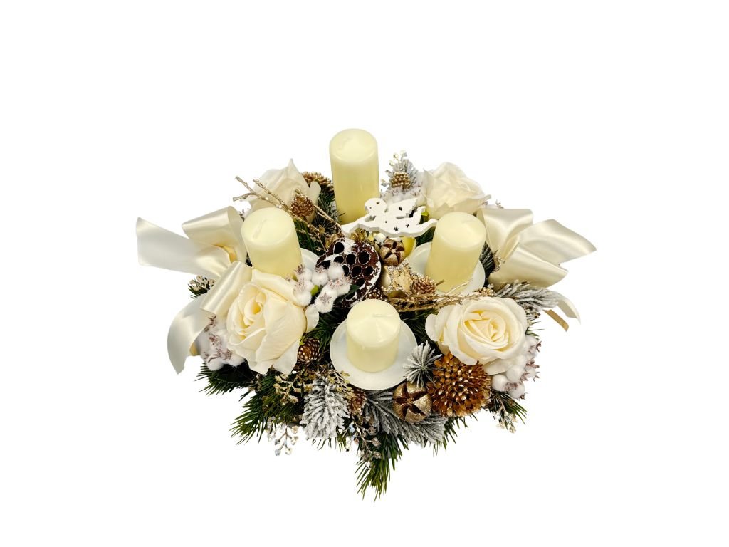 Tento luxusný adventný veniec v krémovo-zlatej farebnej kombinácii pôsobí mimoriadne elegantne a slávnostne. Dominujú mu štyri krémové sviečky zasadené do bohatej výzdoby z hustých ihličnatých vetvičiek, doplnené o sýto biele ruže, zlaté dekorácie a jemne zasnežené prvky. Veniec je ladený do prémiového štýlu, kde sa strieda biela, krémová a zlatá farba, čo vytvára harmonický a luxusný vianočný vzhľad. Výzdobu dotvárajú zlaté šišky, drobné dekoratívne guľôčky, trblietavé vetvičky, zasnežené doplnky a krémové mašle, ktoré celému aranžmánu dodávajú jemnosť a sviatočnú noblesu. Je ideálny do interiéru na stôl, komodu alebo jedálenský stôl – okamžite navodí atmosféru adventného obdobia.