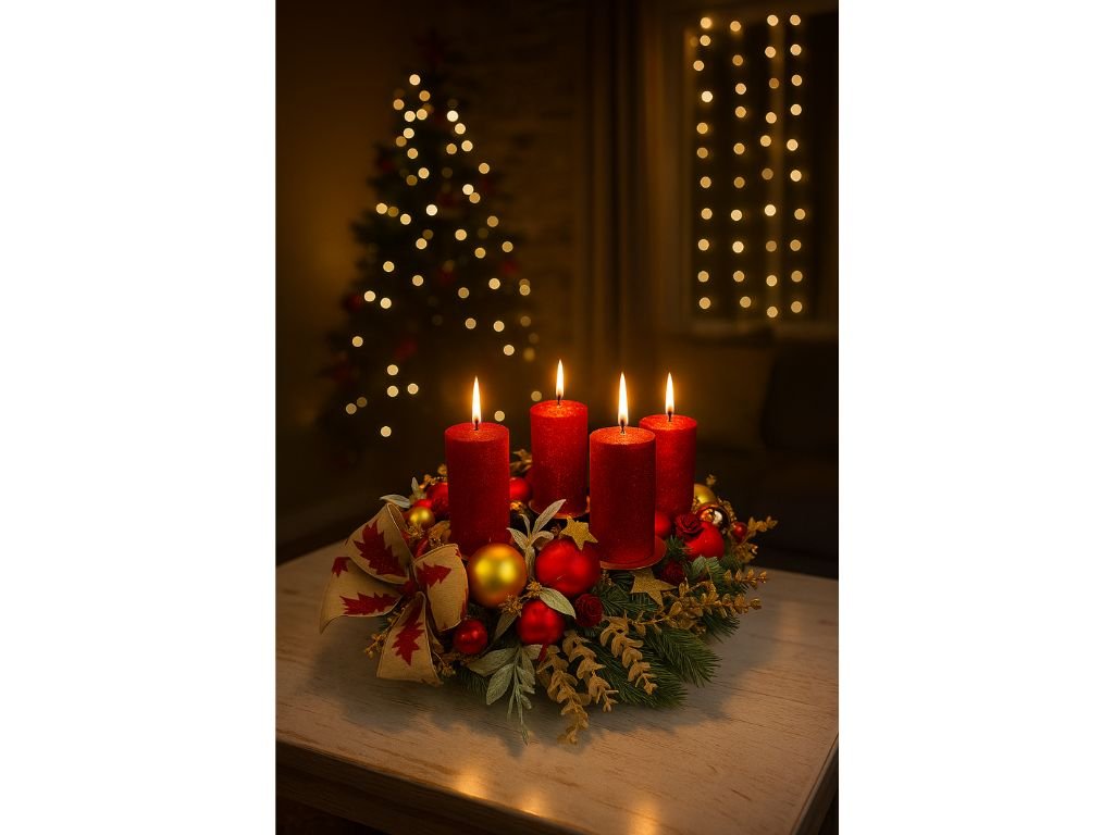 Tradičný adventný veniec v teplých červených a zlatých odtieňoch prinesie do vášho domova tú pravú vianočnú atmosféru. Je bohato zdobený lesklými guličkami, hviezdami, mašľami s vianočným motívom, šiškami a vetvičkami ihličia, ktoré dodávajú kompozícii prirodzený vzhľad. Dominantou sú štyri červené trblietavé sviečky, symbolizujúce štyri adventné nedele, ktoré pri zapálení vytvoria hrejivé a útulné svetlo. Vďaka priemeru 40 cm je ideálnou ozdobou sviatočného stola či konferenčného stolíka. Sviečky sú súčasťou balenia.