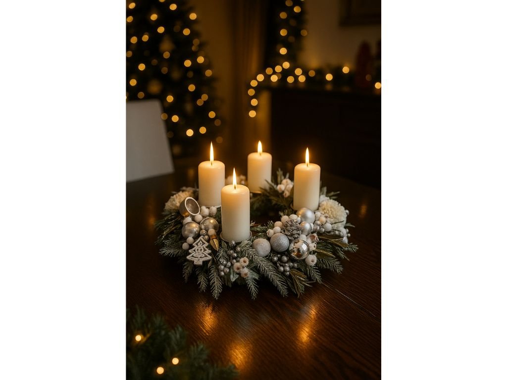 Luxusný vianočný veniec v zlatom a medenom prevedení pôsobí elegantne a hrejivo. Bohaté zelené ihličie dopĺňajú trblietavé ozdoby, šišky, zlaté gule a dekoratívne prvky v teplých metalických odtieňoch. Veniec zdobí postavička anjela a jemná mašľa, ktoré dodávajú kompozícii pokojný, sviatočný charakter. Krémové ruže a detaily z perličiek vytvárajú dojem jemnosti a ladnosti, takže veniec je ideálny ako vianočná ozdoba na dvere, stenu či do interiéru. Sviečky sú súčasťou balenia.
