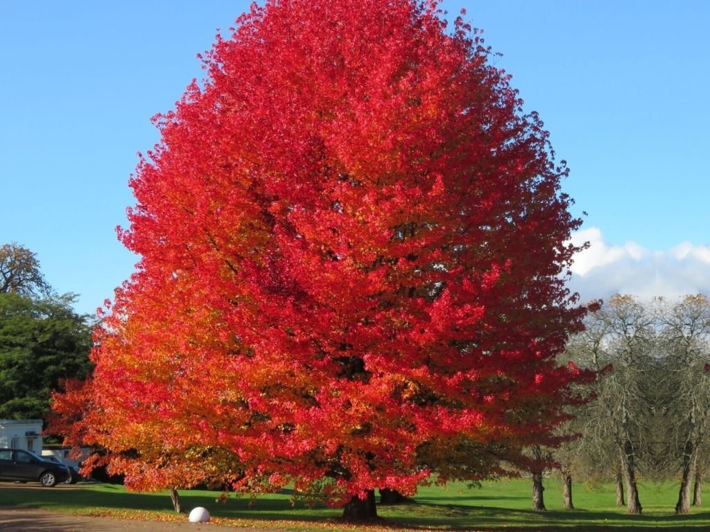 Ambrovník styraxový je impozantný opadavý strom, ktorý je obľúbený pre svoju nádhernú jesennú farebnosť. V lete sú jeho listy lesklé a tmavozelené, no na jeseň sa menia na ohnivé odtiene žltej, oranžovej, červenej a purpurovej, čím vytvárajú úžasné vizuálne divadlo. Tento strom dorastá do výšky 10 až 12 metrov a šírky 6 až 12 metrov, čo ho robí ideálnym ako tieňový strom alebo solitér. Kvety sú nenápadné, žltozelené a objavujú sa na jar, zvyčajne v apríli až máji.