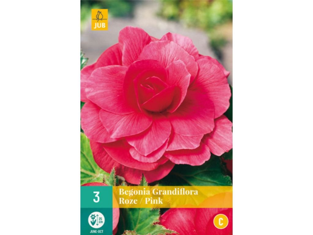 Begónia Grandiflora ‘Pink’ je elegantná hľuznatá begónia s veľmi veľkými, nápadnými kvetmi v jemných až sýtejších ružových odtieňoch. Kvety sú plné až poloplné, bohato vrstvené a patria medzi najväčšie v skupine grandiflora. Pôsobia romanticky a jemne, pričom krásne rozjasnia polotienisté priestory. Rastlina má kompaktný, vzpriamený rast a sviežo zelené, mierne lesklé listy, ktoré zvýrazňujú farbu kvetov. Doba kvitnutia je od júna do októbra. Výška rastliny je cca 30-40 cm, šírka rastliny je 25-35 cm.