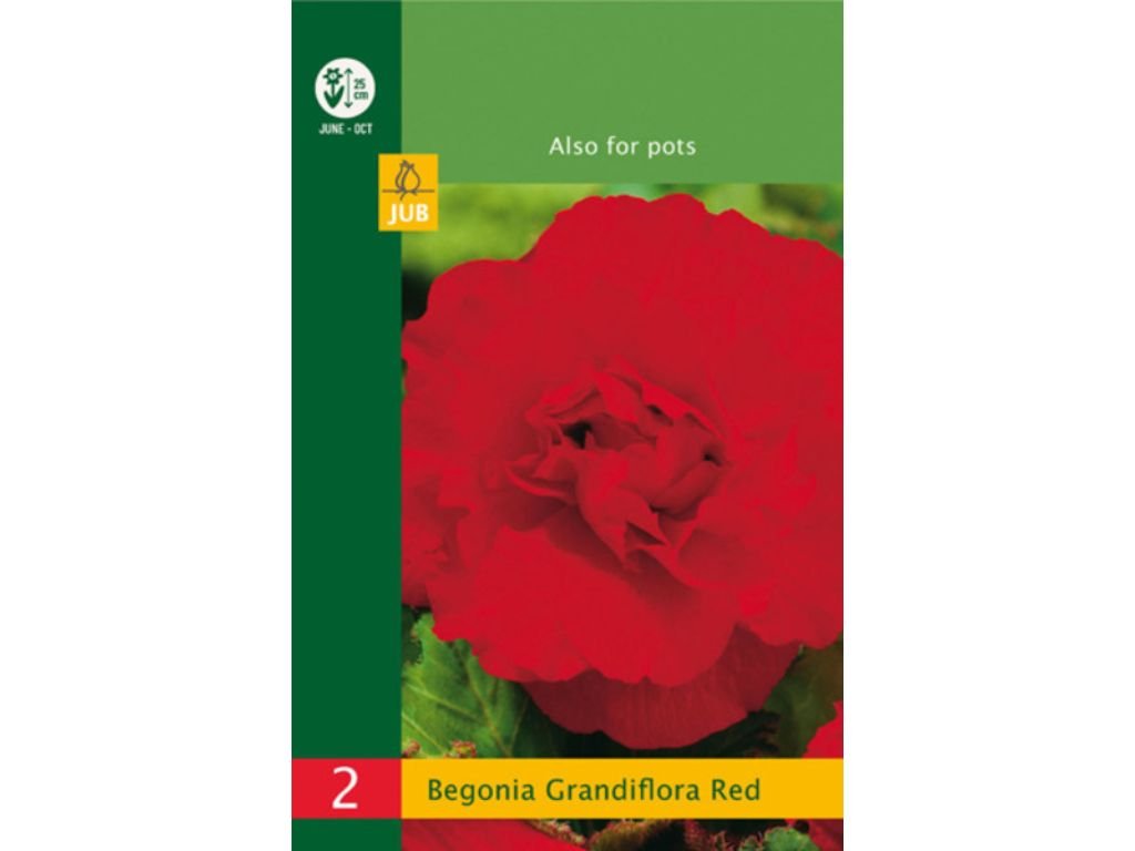 Begónia Grandiflora ‘Red’ je výrazná hľuznatá begónia s veľmi veľkými, nápadnými kvetmi v sýtej, žiarivo červenej farbe. Kvety sú plné až poloplné, bohato vrstvené a patria medzi najväčšie v skupine grandiflora. Intenzívna červená farba pôsobí luxusne a dodáva výsadbe silný farebný akcent. Rastlina má kompaktný, vzpriamený rast a sviežo zelené, mierne lesklé listy, ktoré zvýrazňujú kontrast kvetov. Doba kvitnutia je od júna do októbra. Výška rastliny je cca 30-40 cm, šírka rastliny je cca 25-35 cm.