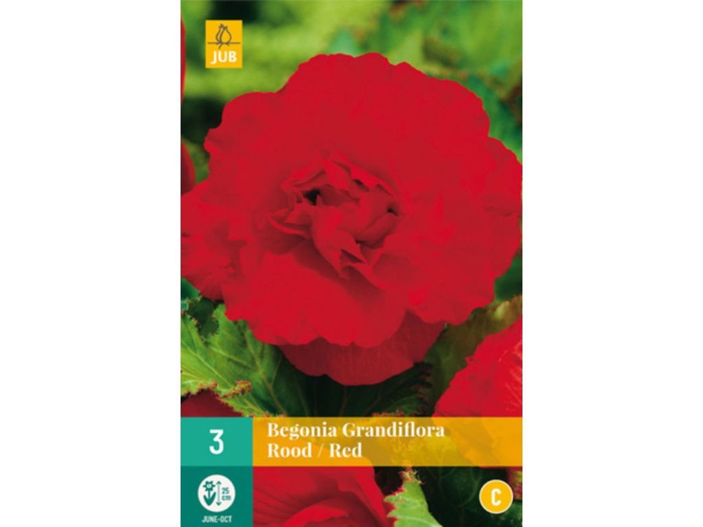 Begónia Grandiflora ‘Red’ je výrazná hľuznatá begónia s mimoriadne veľkými, bohato vrstvenými kvetmi v sýtom červenom odtieni. Kvety patria medzi najväčšie v skupine grandiflora, sú plné až poloplné a majú silný dekoratívny efekt. Intenzívna červená farba pôsobí dominantne a elegantne, vynikne najmä v polotieni, kde farba zostáva sýta a nevybledne. Rastlina má kompaktný, vzpriamený rast a sviežo zelené, mierne lesklé listy, ktoré tvoria výrazný kontrast ku kvetom. Doba kvitnutia je od júna do októbra. Výška rastliny je cca 30-40 cm, šírka rastliny je cca 25-35 cm.