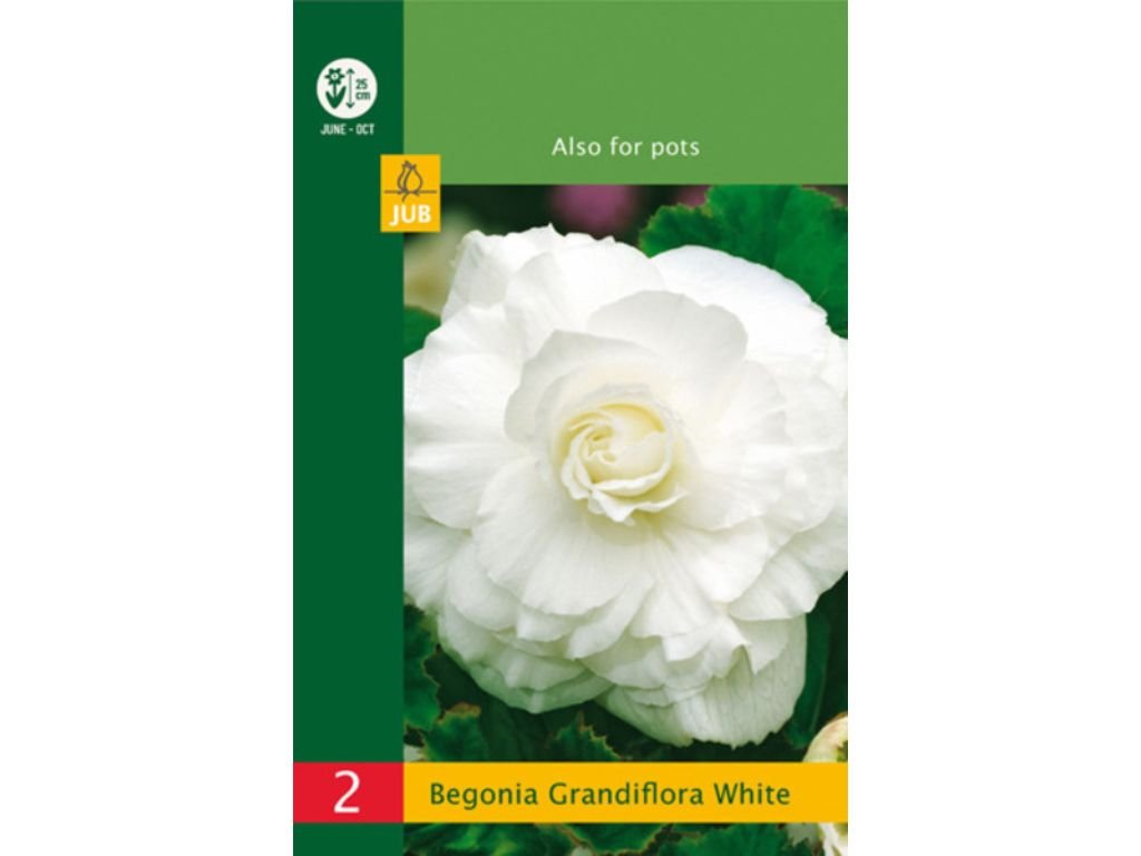 Begónia Grandiflora ‘White’ je elegantná hľuznatá begónia s veľmi veľkými, bohato vrstvenými kvetmi v čisto bielom odtieni. Kvety sú plné až poloplné a patria medzi najväčšie v skupine grandiflora. Ich jemná, svetlá farba pôsobí sviežo a luxusne, krásne rozjasňuje polotienisté miesta a vynikne v kombinácii s tmavšími rastlinami. Rastlina má kompaktný, vzpriamený rast a sviežo zelené, mierne lesklé listy, ktoré vytvárajú výrazný kontrast k bielym kvetom. Doba kvitnutia je od júna do októbra. Výška rastliny je cca 30-40 cm, šírka rastliny je cca 25-35 cm.