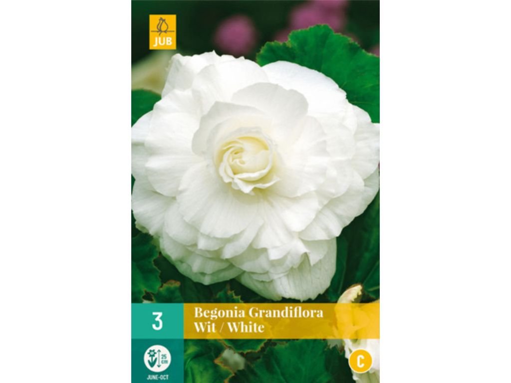 Begónia Grandiflora ‘White’ je elegantná hľuznatá begónia s mimoriadne veľkými, bohato vrstvenými kvetmi v čisto bielej farbe. Kvety sú plné až poloplné a patria medzi najväčšie v skupine grandiflora. Ich svetlý, čistý odtieň pôsobí sviežo a luxusne, krásne rozjasňuje polotienisté miesta a vytvára výrazný kontrast s tmavozelenými listami. Rastlina má kompaktný, vzpriamený rast a udržiava si reprezentatívny vzhľad počas celej sezóny. Doba kvitnutia je od júna do októbra. Výška rastliny je cca 30-40 cm, šírka rastliny je cca 25-35 cm.
