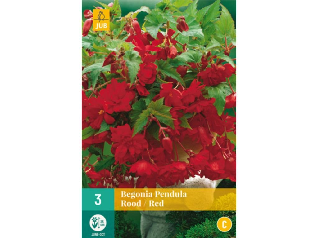 Begónia Pendula ‘Red’ je výrazná previsnutá hľuznatá begónia s bohatým kaskádovým rastom a množstvom veľkých sýto červených kvetov. Kvety sú plné až poloplné, bohato vrstvené a pôsobia luxusne aj z väčšej vzdialenosti. Rastlina vytvára dlhé previsy obsypané kvetmi počas celej sezóny, čo z nej robí ideálnu dominantu závesných nádob a balkónových výsadieb. Sviežo zelené, mierne lesklé listy vytvárajú hustý základ a ešte viac zvýrazňujú intenzívnu červenú farbu kvetov. Doba kvitnutia je od júna do októbra. Výška rastliny je cca 25-35 cm.