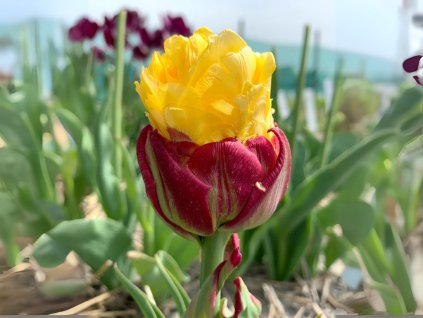 Veľkokvetý plnokvetý tulipán s premenlivou farbou - krémová, oranžová, červená. Pripomína pivóniu, pôsobivý v záhonoch aj vo váze.