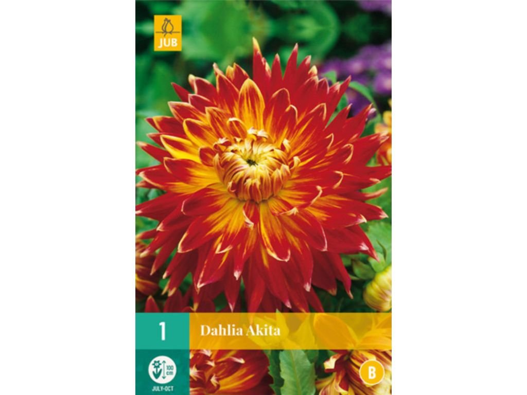 Georgína ‘Akita’ je výnimočná dekoratívna dália, ktorá patrí medzi najpôsobivejšie odrody vďaka svojmu výraznému dvojfarebnému kvitnutiu. Veľké, bohato vrstvené kvety majú sýto červený až bordový základ s kontrastnými krémovo-žltými koncami lupeňov. Tento efekt vytvára žiarivý vzhľad pripomínajúci plamene, vďaka čomu je odroda ‘Akita’ skutočnou dominantou letného záhona. Doba kvitnutia je od júla do októbra. Výška rastliny je cca 90-110 cm, šírka rastliny je cca 40-60 cm.