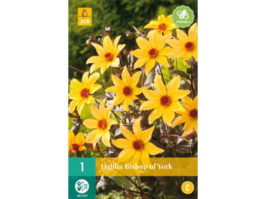 Georgína ‘Bishop of York’ je elegantná odroda zo známej série Bishop, ktorá je typická tmavým bordovým olistením. Táto dália vytvára jednoduché, otvorené kvety v jemnej žltej až zlatožltej farbe so sýtym stredom. Svetlé kvety nádherne kontrastujú s tmavými listami, vďaka čomu pôsobí rastlina veľmi výrazne a moderne. Doba kvitnutia je od júla do októbra. Výška rastliny je cca 80-100 cm, šírka rastliny je cca 40-60 cm.