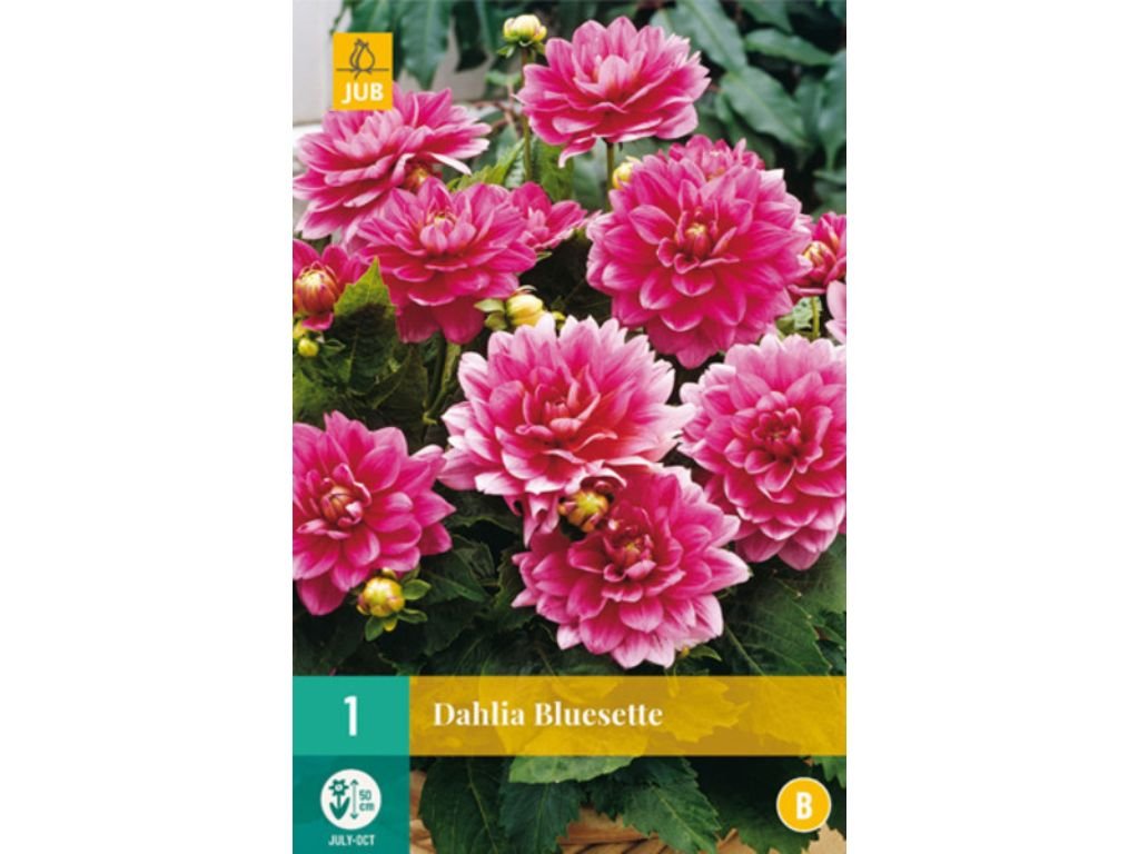 Georgína ‘Bluesette’ je nádherná dekoratívna odroda s bohato plnými kvetmi v sýtej ružovej farbe. Lupeňe sú jemne vrstvené a na koncoch často prechádzajú do svetlejšieho ružového až krémového odtieňa, čo dodáva kvetom elegantný dvojfarebný efekt. Doba kvitnutia je od júla do októbra. Výška rastliny je cca 50-60cm, šírka rastliny je cca 40-50 cm.