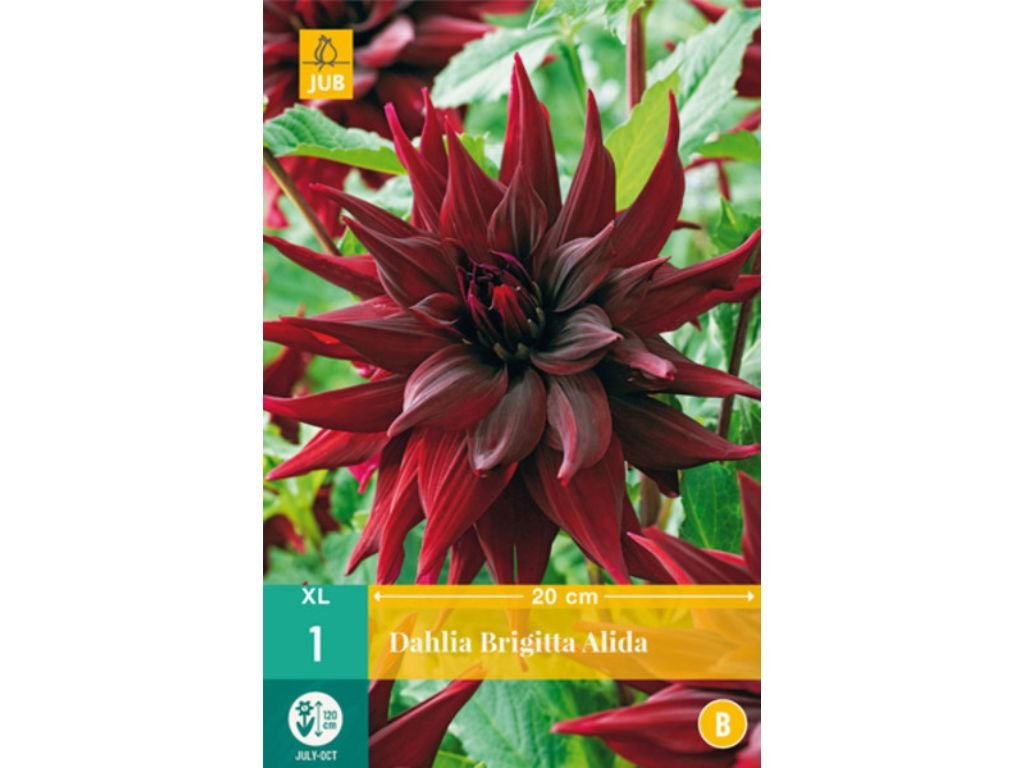 Georgína ‘Brigitta Alida’ je mimoriadne pôsobivá veľkokvetá odroda s dramatickým tmavo bordovým až vínovočerveným sfarbením. Kvety sú veľmi veľké, dosahujú priemer približne 20 cm, a majú dlhé, špicato zakončené lupeňe, ktoré vytvárajú luxusný, takmer zamatový efekt. Doba kvitnutia je od júla do októbra. Výška rastliny je cca 110-120cm, šírka rastliny je cca 50-60 cm.