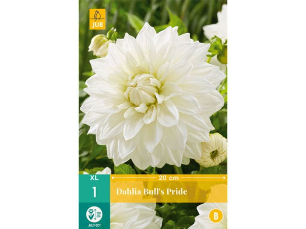 Georgína ‘Bull’s Pride’ je elegantná veľkokvetá dekoratívna dália s nádhernými plnými kvetmi v čisto bielej farbe. Kvety sú bohato vrstvené, pôsobia luxusne a dosahujú priemer približne 20 cm, vďaka čomu patrí medzi najvýraznejšie biele odrody georgín. Doba kvitnutia je od júla do októbra. Výška rastliny je cca 90-100cm, šírka rastliny je cca 50-60 cm.