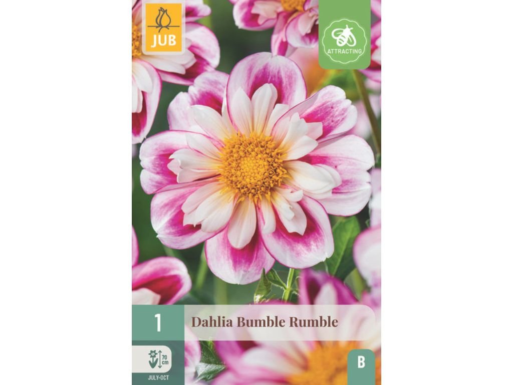 Georgína ‘Bumble Rumble’ je nádherná jednoduchokvitnúca dália, ktorá zaujme výrazným kontrastným sfarbením kvetov. Lupeňe majú biely základ s výrazným fialovo-ružovým lemovaním, zatiaľ čo stred kvetu je veľký, zlatožltý a otvorený. Výška rastliny je cca 60-70cm, šírka rastliny je cca 40-50 cm.