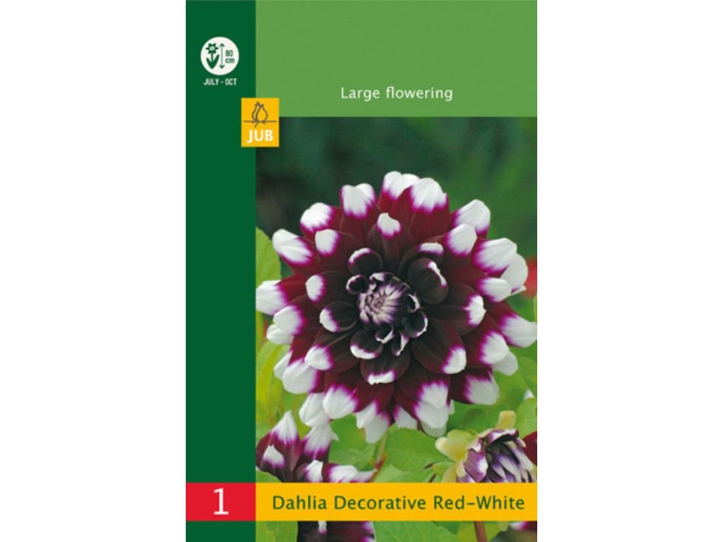 Georgína Decorative Red-White je dekoratívna dália s plnými, pravidelne vrstvenými kvetmi, ktoré majú výrazné dvojfarebné sfarbenie. Základ kvetu je tmavočervený až vínový a konce lupeňov sú čisto biele, takže kvet pôsobí veľmi kontrastne a „bodkovane“ podľa toho, ako sú biele špičky rozmiestnené po celej ploche kvetu. Šírka rastliny je cca 40-60 cm.