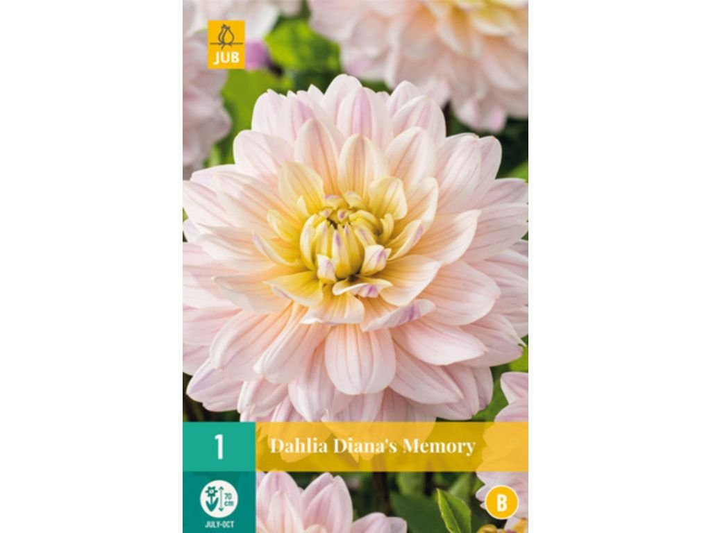 Georgína ‘Diana’s Memory’ je jemná dekoratívna odroda s romantickým pastelovým vzhľadom. Kvety sú bohato plné, pravidelne vrstvené a majú veľmi svetloružové lupeňe s jemným nádychom do perleťova. Stred kvetu je svetložltý, čo vytvára mäkký, teplý kontrast a dodáva kvetu „žiarivý“ efekt. Šírka rastliny je cca 40-50 cm.