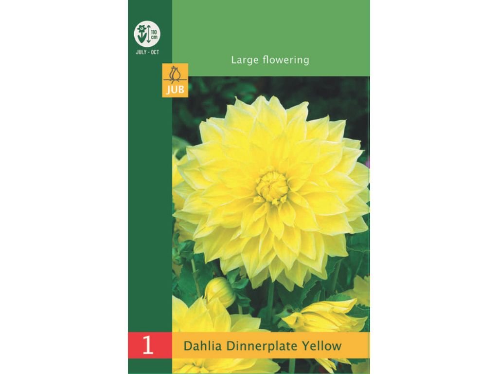 Georgína ‘Dinnerplate Yellow’ je veľkokvetá dekoratívna dália s mohutnými, bohato plnými kvetmi v sýtej žltej farbe. Kvety sú široko rozvinuté, pravidelne vrstvené a pôsobia „tanierovým“ dojmom – presne tak, ako to napovedá názov Dinnerplate. Žltý odtieň je čistý a výrazný, takže rastlina v záhone doslova rozžiari výsadbu. Šírka rastliny je cca 50-70 cm.