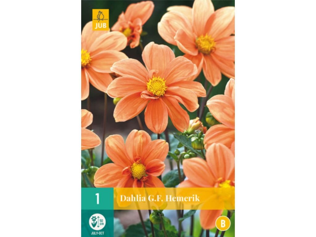 Georgína ‘G.F. Hemerik’ je jemná, včelám priaznivá odroda s jednoduchými až polojednoduchými kvetmi, ktoré pôsobia ľahko a prirodzene. Kvety majú teplú marhuľovo-oranžovú farbu a uprostred výrazný žltý terčík, ktorý je dobre prístupný opeľovačom. Lupeňe sú široké, hladké a rovnomerne rozložené do tvaru hviezdy, takže kvet vyzerá čisto a elegantne. Šírka rastliny je cca 35-45 cm.