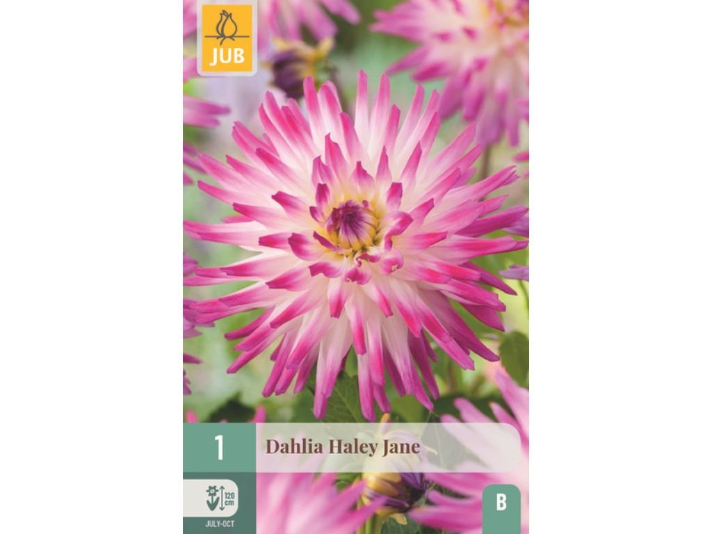 Georgína ‘Haley Jane’ je výrazná kaktusová georgína s dramatickým tvarom kvetu. Kvety tvoria dlhé, úzke, špicato zakončené lupeňe, ktoré sú rozložené do „hviezdicového“ tvaru. Sfarbenie je veľmi kontrastné a dobre čitateľné: základ lupeňov je biely až krémovo biely, smerom ku koncom prechádza do výraznej ružovej až fuchsiovej, pričom ružová je najintenzívnejšia na špičkách. V strede kvetu je viditeľný jemne žltkastý nádych pri báze lupienkov. Šírka rastliny je cca 50-70 cm.