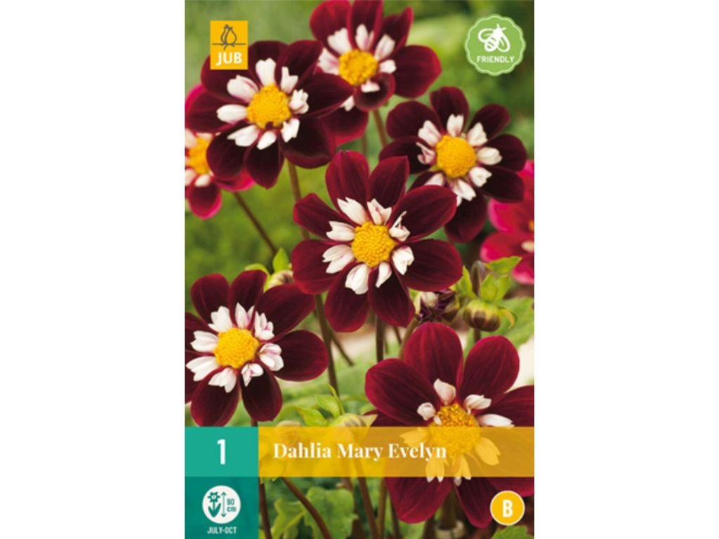 Georgína ‘Mary Evelyn’ je výrazná odroda s jednoduchými až poloplnými kvetmi, ktoré sú otvorené a veľmi atraktívne pre opeľovače. Kvety majú kontrastné sfarbenie: hlavné lupeňe sú tmavé vínovočervené až bordové, pričom pri strede vytvárajú typický „golier“ z kratších lupeňov v bielej farbe. Stred kvetu je žiarivo žltý terčík, ktorý ešte viac zvýrazní kontrast tmavých lupeňov. Šírka rastliny je cca 40-60 cm.