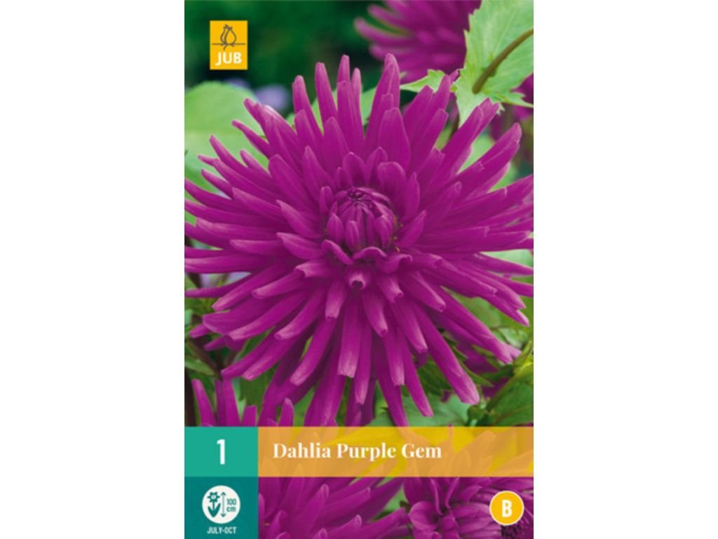 Georgína ‘Purple Gem’ je výrazná kaktusová dália s plným kvetom. Kvety tvoria dlhé, úzke a výrazne zašpicatené lupene, ktoré sú miestami mierne stočené do „trubičiek“, takže celý kvet pôsobí ihličkovito a dynamicky. Farebne je veľmi sýta – intenzívna purpurová až fuchsiová v jednotnom tóne, so stredom v rovnakej farbe. Kvitne spoľahlivo od leta až do prvých mrazov a v záhone robí silný farebný akcent; hodí sa aj na rez. Šírka rastliny je cca 40-60 cm.