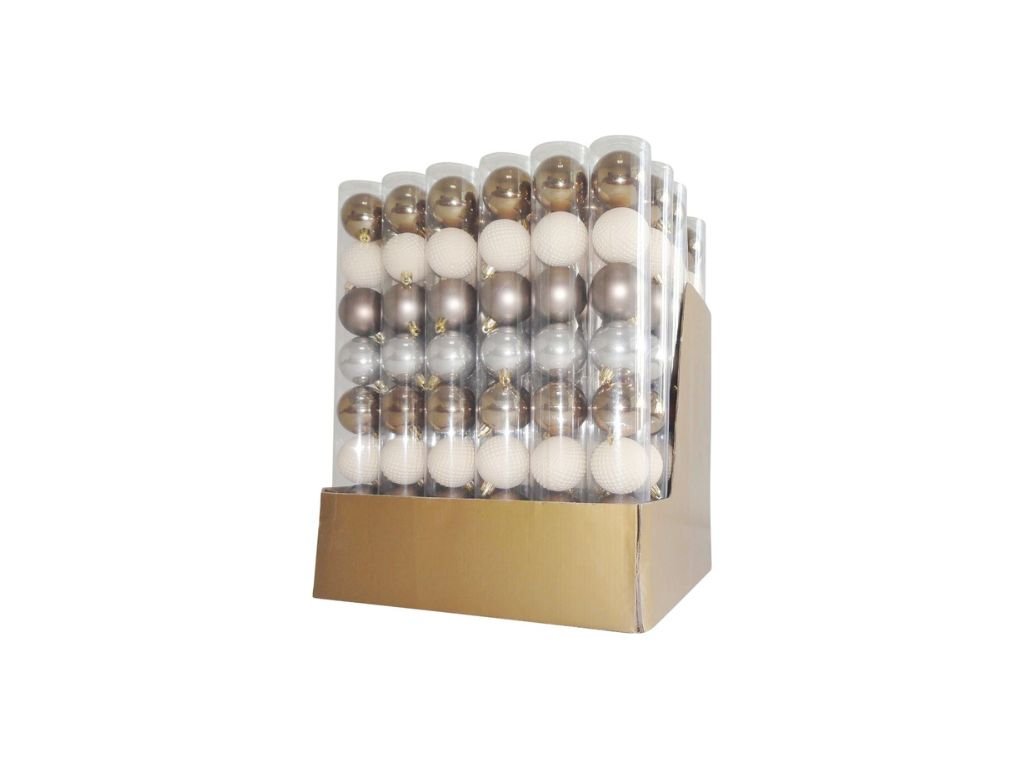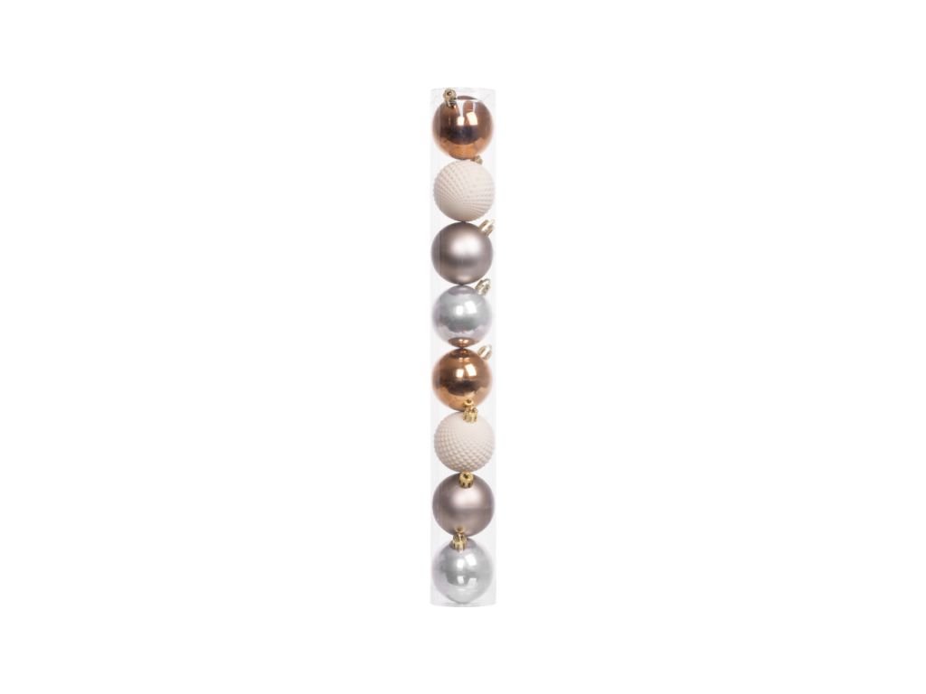 Súprava ozdôb na stromček slúži na slávnostné ozdobenie vianočného stromčeka. Pozostáva z 8 ks vianočných gúľ s priemerom 5 cm. Farba gúľ je biela, strieborná a bronzová. Sú vyrobené z plastu.