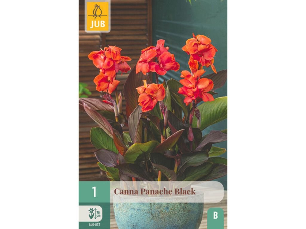 Kana (Canna) ‘Panache Black’ je výnimočná letná hľuznatá rastlina, ktorá zaujme kontrastom tmavých listov a žiarivých kvetov. Kvety sú veľké, v odtieňoch oranžovo-červenej pôsobia exoticky a veľmi dekoratívne.