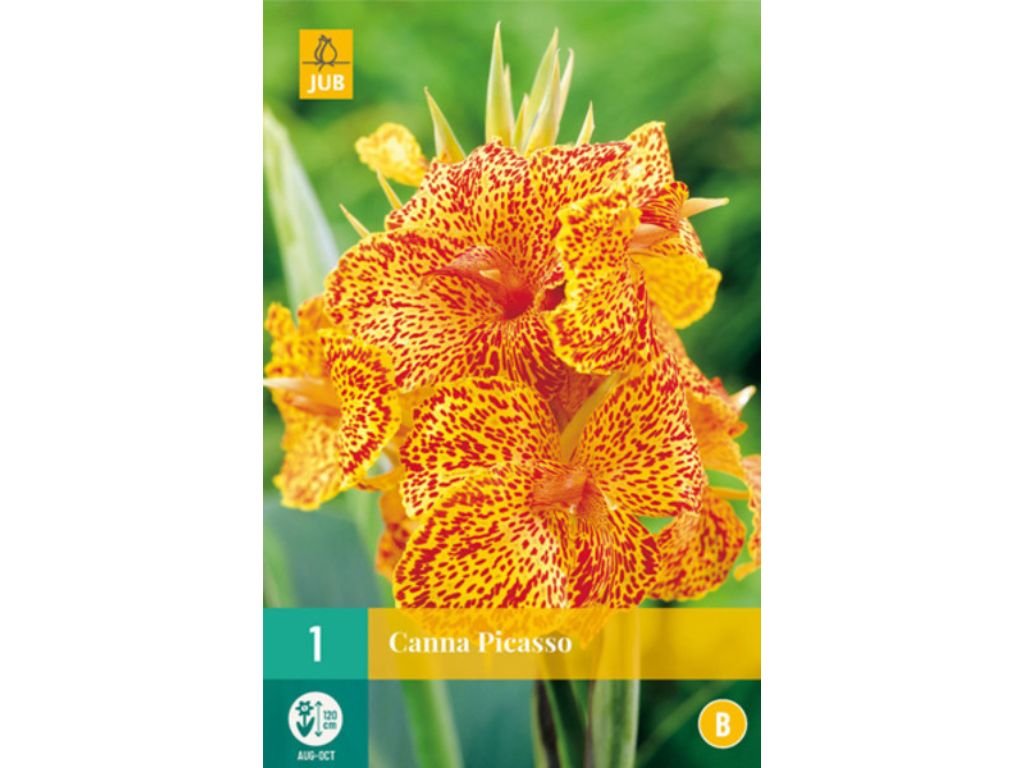 Kana (Canna) ‘Picasso’ je mimoriadne výrazná exotická hľuznatá rastlina, ktorá zaujme už na prvý pohľad svojimi nezameniteľnými kvetmi. Kvety majú žiarivo žltý základ, ktorý je husto posiaty červenými až oranžovočervenými škvrnami a pruhmi. Tento „maľovaný“ vzhľad pôsobí veľmi dramaticky a robí z odrody skutočný unikát medzi kanami.