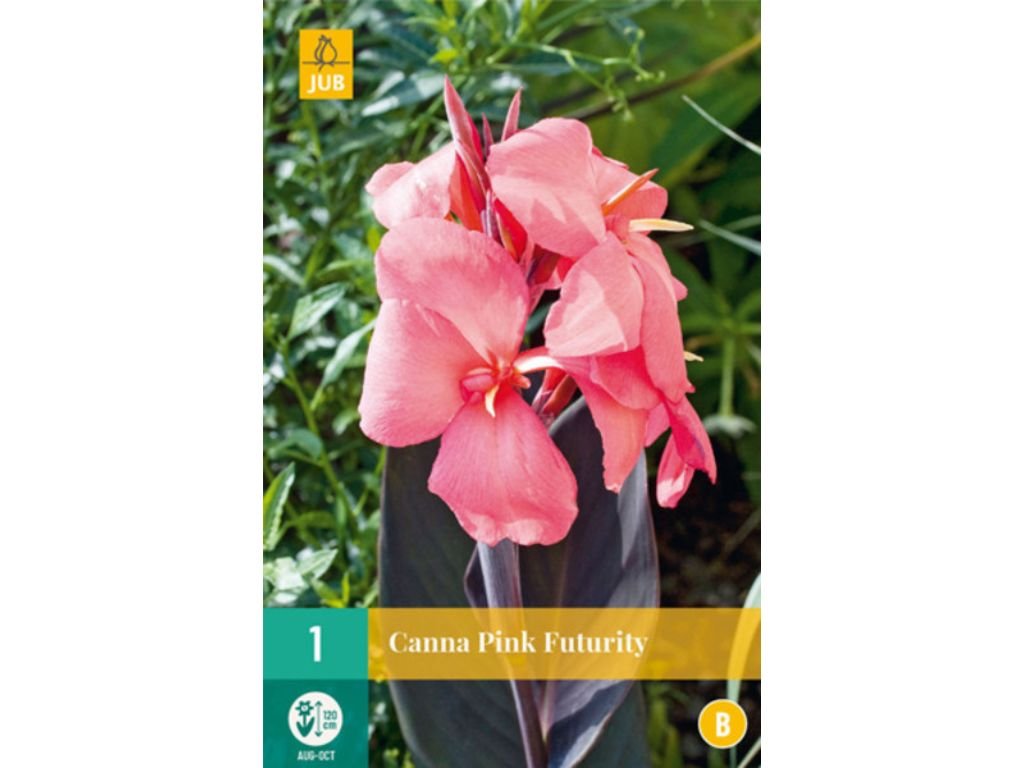Kana (Canna) ‘Pink Futurity’ je atraktívna exotická hľuznatá rastlina, ktorá zaujme veľkými jemne ružovými kvetmi s elegantným a čistým vzhľadom. Kvety majú lososovo ružový tón, pôsobia moderne a veľmi vkusne, vďaka čomu je odroda vhodná aj do romantických výsadieb.