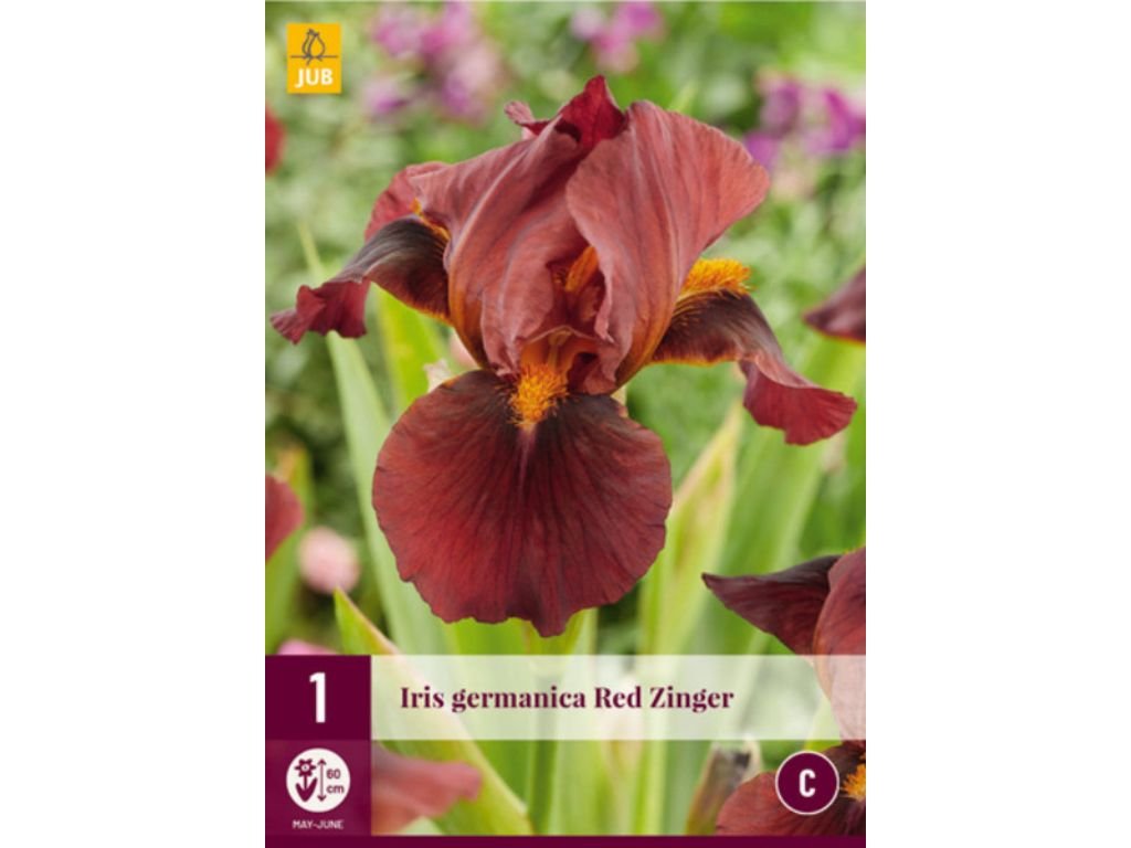 Kosatec nemecký ‘Red Zinger’ je výrazná veľkokvetá trvalka s teplým, tmavočerveným až vínovým sfarbením kvetov. Okvetné lístky majú jemne zvlnený okraj a v strede sú doplnené kontrastnými oranžovo-žltými fúzmi, ktoré zvýrazňujú celkový vzhľad kvetu. Kvety rozkvitajú na pevných, vzpriamených stonkách v období máj – jún.