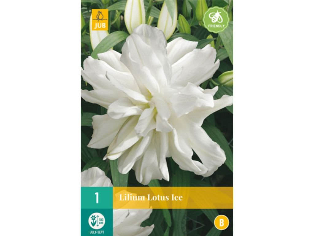 Ľalia ‘Lotus Ice’ (Lilium) je elegantná ázijská ľalia s plnými kvetmi, ktorá zaujme čistým, snehobielym sfarbením a bohatou štruktúrou kvetu. Kvety sú viacvrstvové, husté a kompaktné, pripomínajúce kvet lotosu. Vďaka plnému kvetu sú tyčinky výrazne potlačené alebo úplne chýbajú, čo znamená minimálny až žiadny peľ – ideálna vlastnosť na rez aj do blízkosti terás.