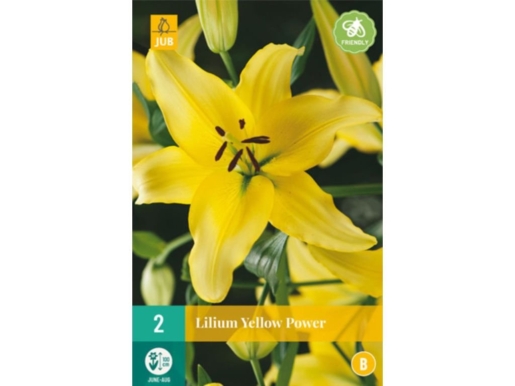 Ľalia ‘Yellow Power’ (Lilium) je výrazná ázijská ľalia so sýto žltými kvetmi, ktoré pôsobia energicky, sviežo a veľmi dekoratívne. Kvety sú veľké, otvorené, hviezdicovité a smerované mierne nahor a do strán. Okvetné lístky majú jednotnú, jasnú žltú farbu, v strede jemne prechádzajúcu do zelenkastého nádychu, ktorý zvýrazňuje prirodzenú kresbu kvetu.