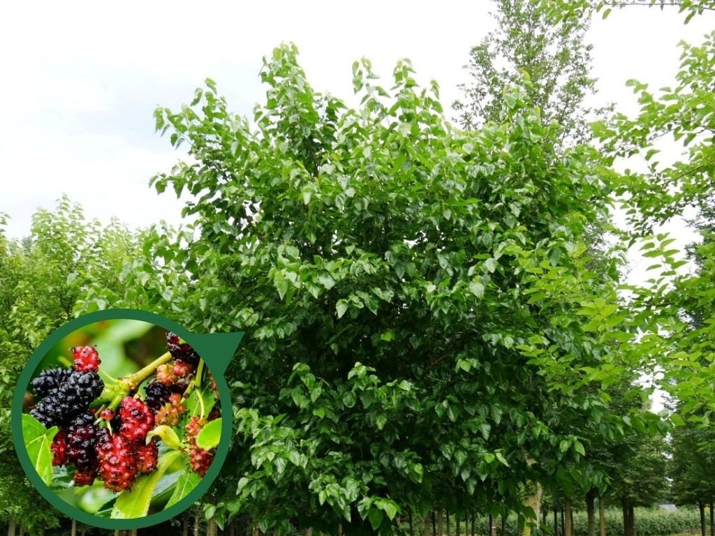 Škvrnitosť listov Moruše bielej: Po bohatom plodení v druhej polovici leta môže dôjsť k vysileniu stromov, čo spôsobuje škvrnitosť listov a ich skorý opad. Tento jav je obzvlášť výrazný v rokoch s bohatou úrodou, keď sú stromy vyčerpané z produkcie plodov. Listy môžu byť posiate škvrnami a začnú predčasne opadávať, čo je signálom stresu stromu.