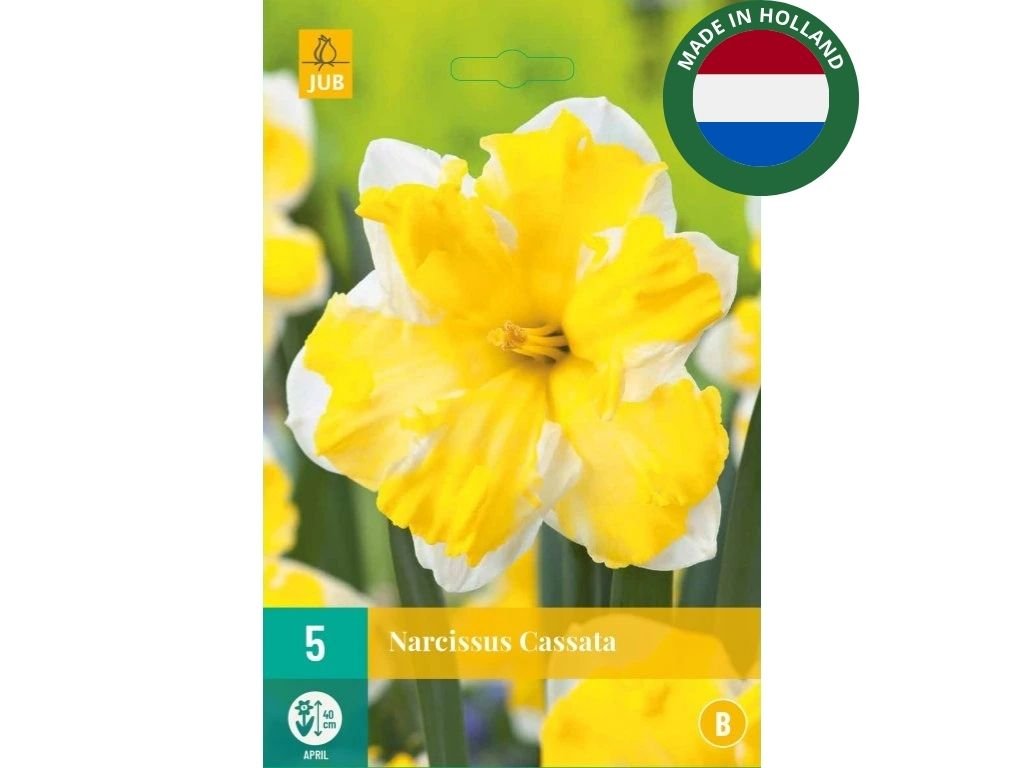 Narcis 'Cassata' je výrazná a nezameniteľná odroda patriaca medzi trubkovité (trumpet) narcisy. Zaujme svojím neobvyklým vzhľadom – jeho vonkajšie okvetné lístky sú krémovo biele, zatiaľ čo veľká trúbkovitá korunka má sýtožltú farbu, ktorá sa počas kvitnutia rozširuje a jemne bledne, čím vytvára efekt „roztvorenej koruny“. Kvitne v marci až apríli a dosahuje výšku približne 35 cm. Vďaka svojmu zaujímavému tvaru a kontrastnej farebnosti je mimoriadne obľúbený v záhonoch, pri lemovaní chodníkov, ale aj vo voľnej výsadbe.