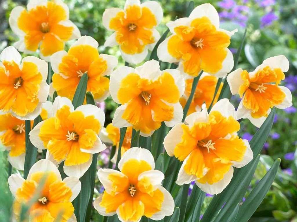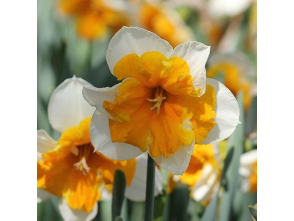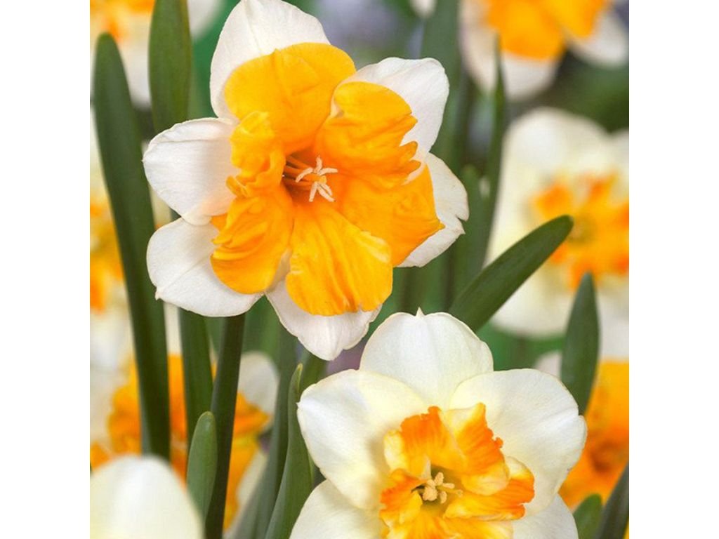 Narcis ‘Orangery’ je dekoratívny dvojitý narcis s bielym kvetom a oranžovým stredom, vhodný na záhony aj rez.