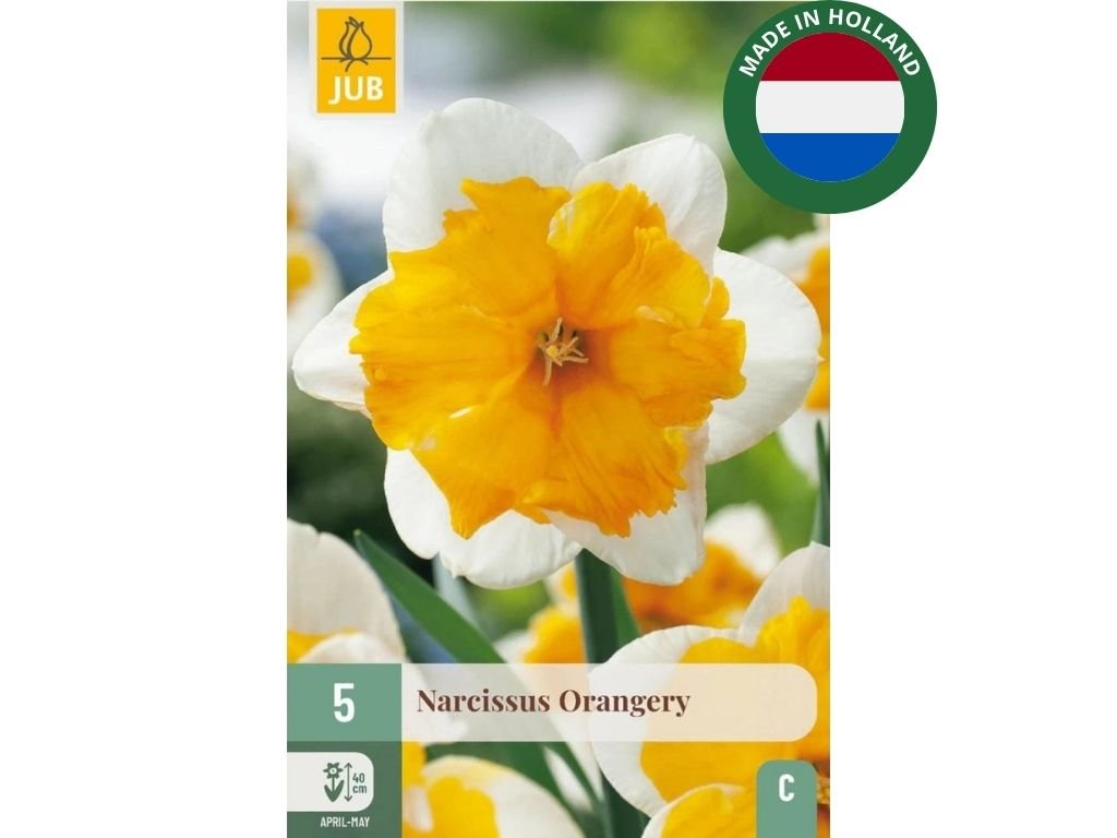 Narcis ‘Orangery’ je veľkokvetý, dvojitý kultivar s výnimočne dekoratívnym vzhľadom. Jeho biele okvetné lístky vytvárajú kontrast s bohatým, oranžovým, plne vyplneným vnútorným vencom. Kvet má vrstvenú štruktúru, vďaka čomu pôsobí takmer ako kvet ruže. Je veľmi obľúbený v zmiešaných jarných výsadbách aj ako rezaný kvet, pretože si dlho udrží svoj tvar a farbu. Rastlina dorastá do strednej výšky a je spoľahlivo mrazuvzdorná.