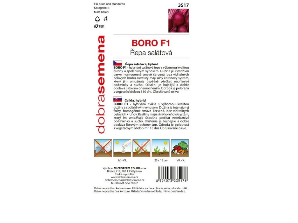 BORO F1 je guľatá červená repa do nepohody so spoľahlivým výnosom. Pochádza z rovnakej holandskej šľachtiteľskej dielne ako obľúbený hybrid PABLO F1. Na rozdiel od svojho jemnejšieho brata má silný koreňový systém, ktorý jej umožňuje úspešne prečkať nepriaznivé podmienky a sucho. Rovnako olistenie je bujné a lepšie odoláva listovým ochoreniam. BORO F1 je hybrid s výbornou kvalitou dužiny, tá je homogénne tmavo červená, bez viditeľných belavých kruhov. Odroda je poloskorá s vegetačnou dobou 110 dní. Obrusované osivo, vysievajte na vzdialenosť 5 – 7 cm v riadku, aby ste už nemuseli jednotiť.