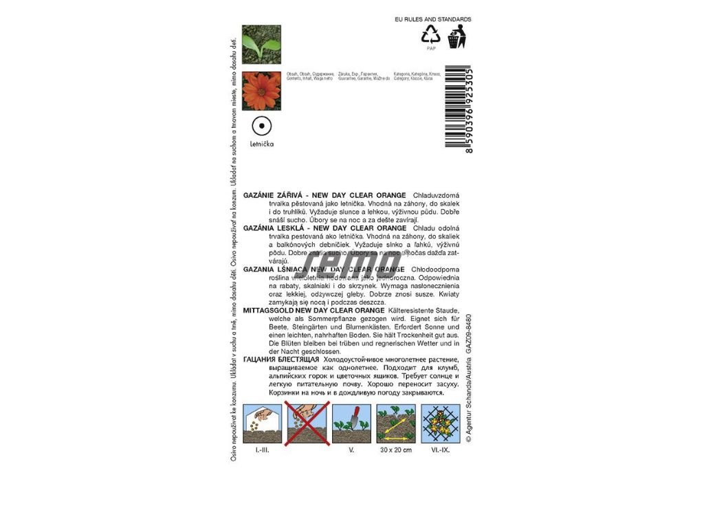 Gazania má výšku 20–25cm a pevnú, kompaktnú stonku. Univerzálne využitie, výborná na pestovanie v kvetináčoch aj ako lemovanie záhonov. Farba je jasne oranžová, bez čierneho stredu. Letnička vhodná na ucelenejšie výsadby do letničkových záhonov, do skaliek aj do truhlíkov. Má kopijovité, zospodu striebristé listy a margarétkovité jednoduché úbory. Vysádzame na plne slnečné a suchšie stanovište. V polotieni, v noci a za dažďa sa kvetné úbory zatvárajú.