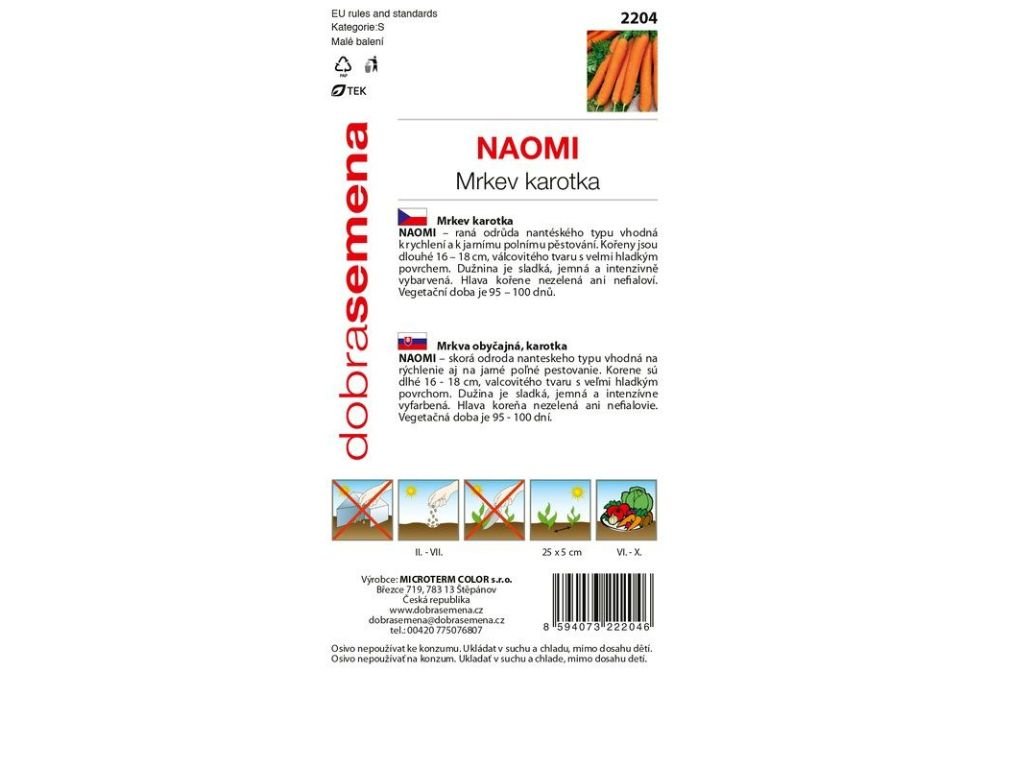 Mrkva skorá Naomi je odroda nantéského typu vhodná na rýchlenie a na jarné poľnému pestovania. Korene sú dlhé 16 -18 cm ,valcovitého tvaru s jemným hladkým povrchom. Dužina je sladká, jemná a intenzívne vyfarbená. Hlava koreňa nezelená ani nefialovie. Je určená predovšetkým na priamy konzum. Vegetačná doba je 95 - 100 dní. Pestovanie: Semená mrkvy vysievame v apríli až v máji. Plody zbierame od júla až do októbra. Najlepšie sa jej darí v úrodných pôdach bohatých na humus. Vyžaduje slnečné stanovisko.