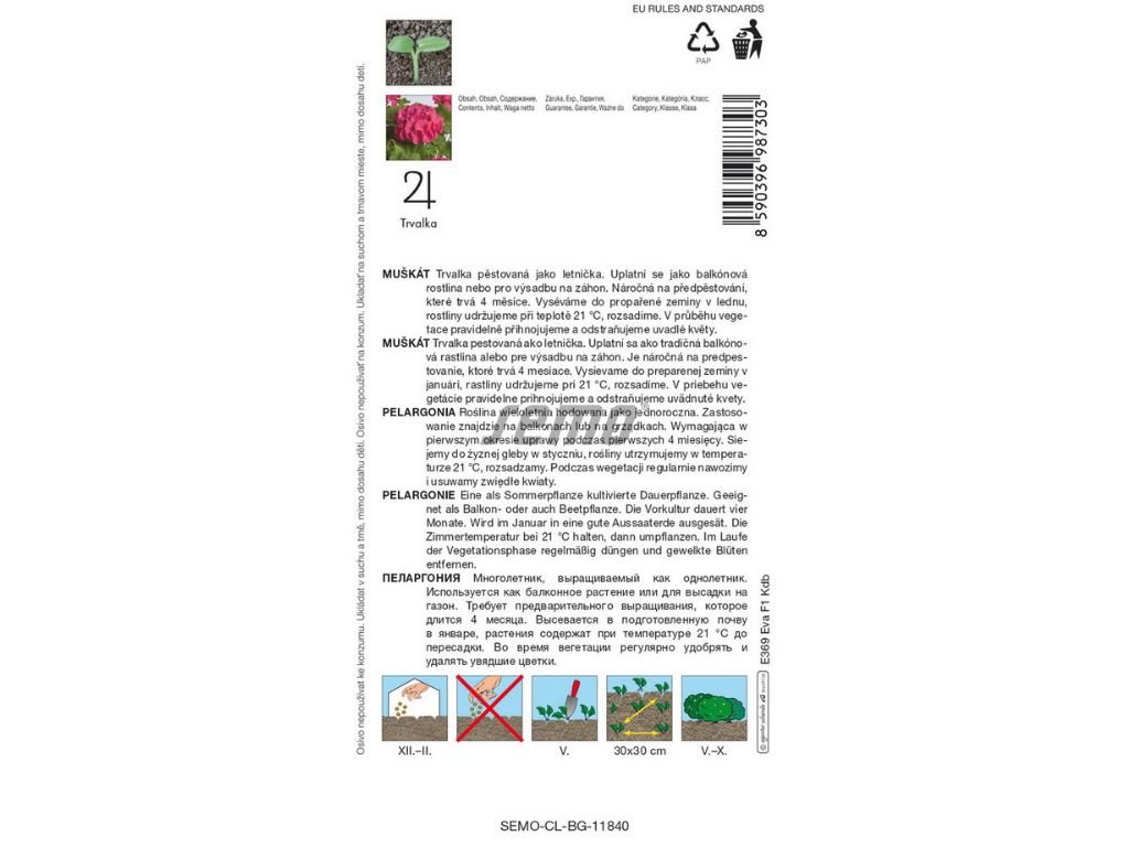 Muškát obyčajný Eva F1 je obľúbená trvalka pestovaná ako letnička. Vyžaduje slnečné stanovište a prevzdušnenú neutrálnu až zásaditú pôdu. Vybrané odrody majú veľmi dekoratívne listy. Muškát vzpriamený Eva F1 je vhodný na pestovanie v nádobách aj na záhonoch. Semená klíčia za 7 až 10 dní pri dodržaní teploty 21 °C. Rastliny tohto muškátu vzpriameného prepichujeme 3 týždne po výseve. Farba kvetu je atraktívna červenofialová, listy sú zelené s výraznou kresbou. Rastliny majú silné a pevné stonky.