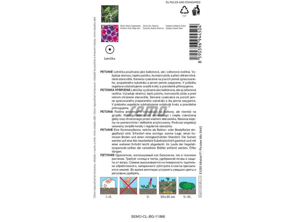 Veľkokvetá, zmes farieb s bielym lemovaním. Petúnia veľkokvetá Mistral Picotee F1 je skorá, nízka (30 až 35 cm) veľkokvetá petúnia v zmesi farieb. Kvety s priemernou veľkosťou 8 až 10 cm sú ružovej, ružovofialovej a tmavo fialovej farby s bielym lemovaním a vykvitajú na rastline po celú sezónu. Petúnia veľkokvetá Mistral Picotee F1 sa vyznačuje vysokou odolnosťou voči nepriaznivým podmienkam a rastliny aj po silných dažďoch veľmi rýchlo regenerujú. Na intenzívnejšie kvitnutie sa odporúča odkvitnuté kvety vyštipovať. Túto petúniu vysádzame buď do nádob alebo na záhony, kde rastliny vytvoria kompaktný porast.