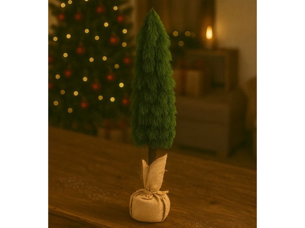 Stromček stojí na pevnom kmeni a jeho základňa je ozdobne zabalená v jutovom obale, čo mu dodáva rustikálny a prírodný charakter. Vďaka svojej výške 55 cm je ideálny ako dekorácia na komodu, konferenčný stolík, recepciu či vstupnú halu. Skvele sa hodí aj ako doplnok k väčšiemu vianočnému stromčeku, čím podčiarkne útulnosť a sviatočný štýl interiéru.