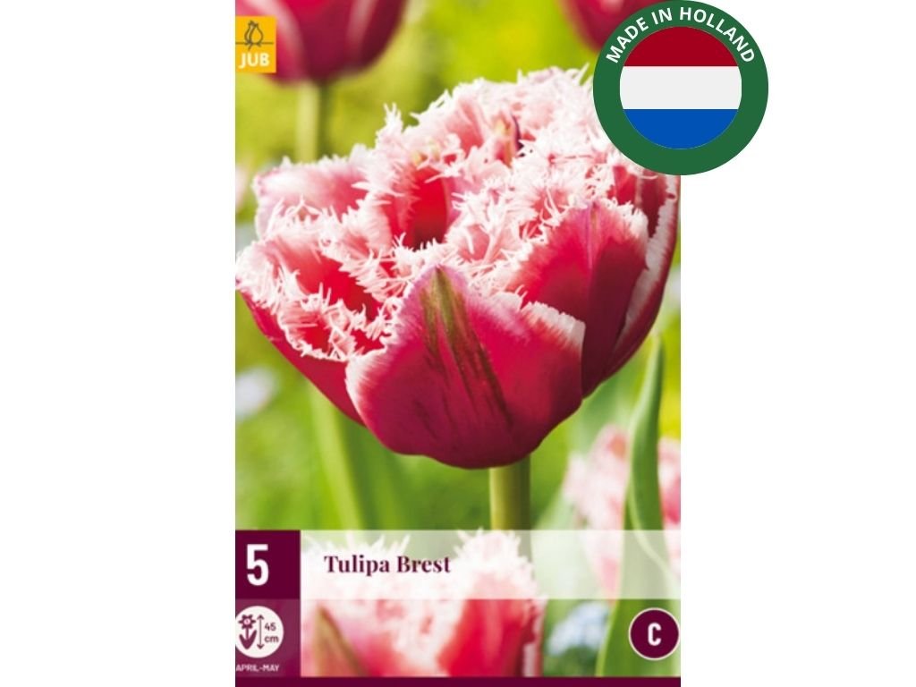 Tulipán Brest je nápadný a elegantný zástupca skupiny Triumph, ktorý upúta na prvý pohľad červeným základom a ostrými bielymi okrajmi, akoby boli kvety zaliate snehovou čipkou. Tento dvojfarebný efekt je veľmi dekoratívny a pôsobí luxusne. Kvety sú pevné, kalichovitého tvaru, nesené na robustných stonkách, ktoré dobre odolávajú vetru. Vyniká v skupinovej výsadbe aj vo váze.