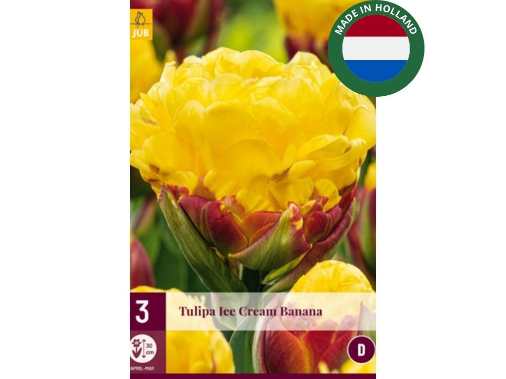 Tulipán Ice Cream Banana je extravagantná novinka, ktorá upúta pozornosť svojim jedinečným vzhľadom. Husté, plnokveté kvety majú maslový až krémovo-žltý stred, ktorý kontrastuje s vonkajšími lístkami vo svetlozelenom až ružkastom tóne. Tvarovo pripomína kopček zmrzliny vo farebnom obale, odtiaľ aj jeho názov. Patrí medzi neskoré tulipány a je ideálny ako solitér či skupinová dominanta v menšom záhone.