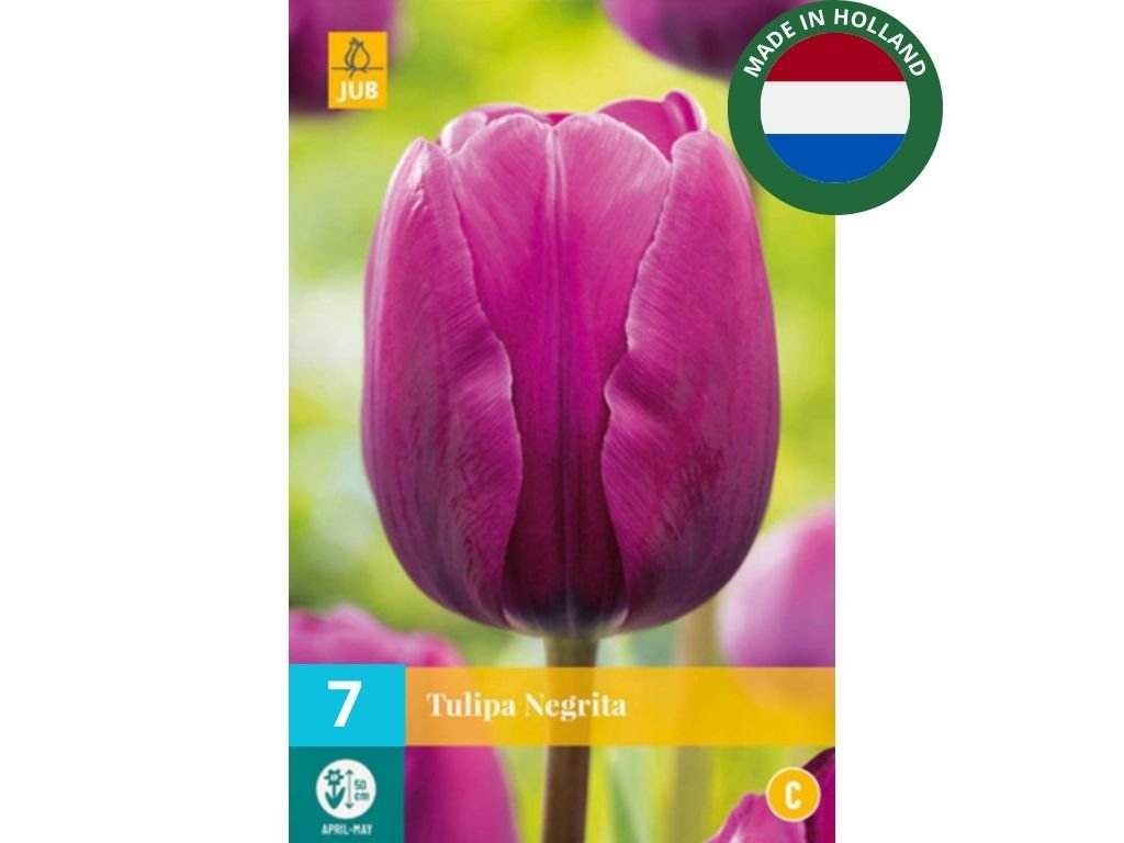 Tulipán Negrita patrí medzi najobľúbenejšie kultivary triedy Triumph. Je známy svojimi bohatými, sýto purpurovými kvetmi s jemným vínovým až fialovým odtieňom, ktoré v slnečnom svetle získavajú zamatový lesk. Kvety sú pevné, symetricky tvarované a držia sa na silných, odolných stonkách, ktoré výborne odolávajú vetru a dažďu. Tento tulipán pôsobí elegantne a luxusne, pričom je vďaka svojej odolnosti výbornou voľbou do záhonov, na rez aj do nádob. V skupinovej výsadbe vytvára výrazný farebný kontrast so svetlejšími alebo bielymi odrodami.
