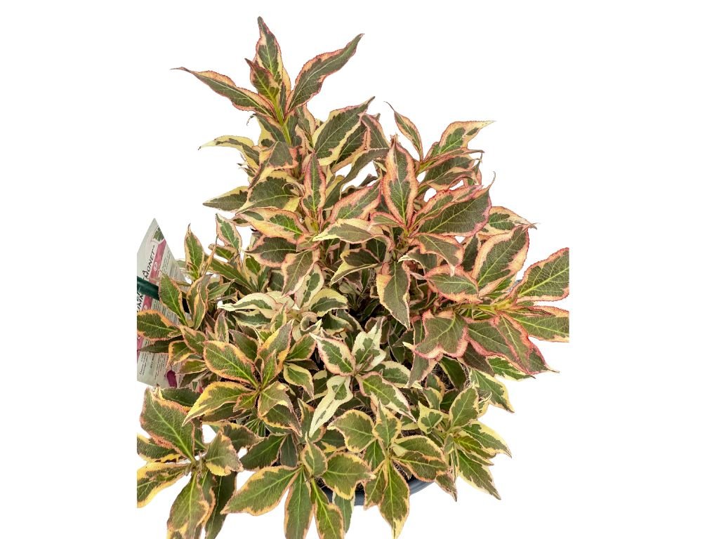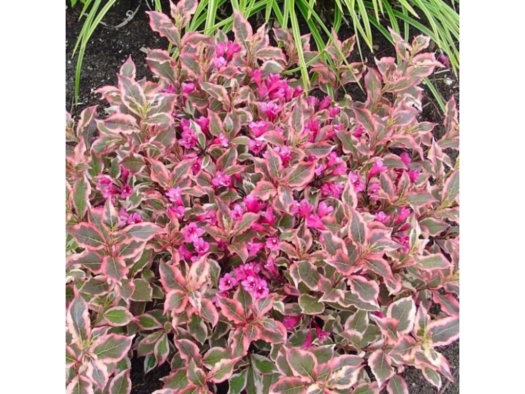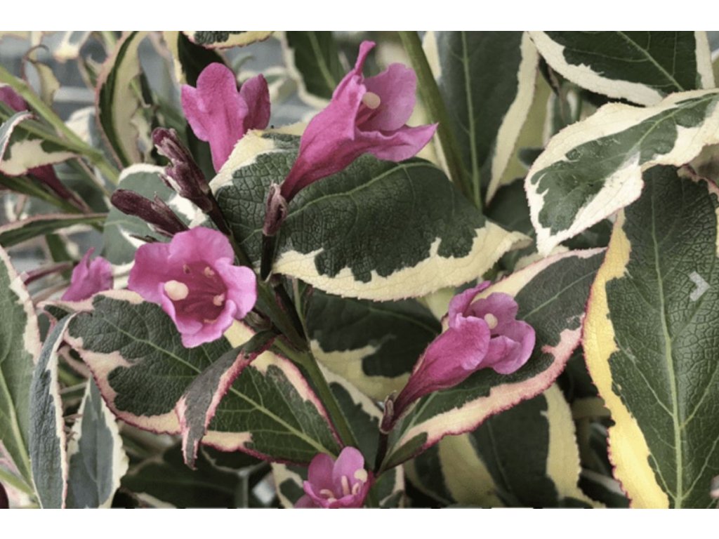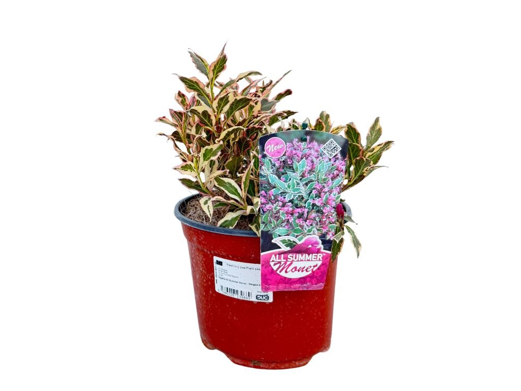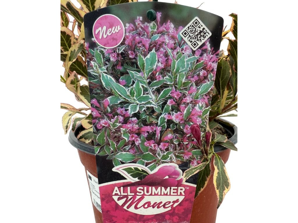 Weigela florida 'All Summer Monet' je nízky, kompaktný opadavý ker s výrazným panašovaným olistením a jemnými ružovými kvetmi. Jej listy majú jedinečné sfarbenie – stred je svetlozelený až zelený a okraje sú smotanovo biele s jemným nádychom do ružova, čo vytvára dekoratívny efekt počas celej sezóny. Od mája do júna kvitne drobnými trúbkovitými kvetmi bledoružovej farby, ktoré sa objavujú aj počas leta v menšom rozsahu. Vďaka svojmu pomalému rastu a malému vzrastu je ideálna do menších záhonov, predzáhradiek, k lemovaniu chodníkov alebo na výsadbu do nádob. Ocení ju každý, kto hľadá elegantný, ale nenáročný okrasný krík s celosezónnym efektom.