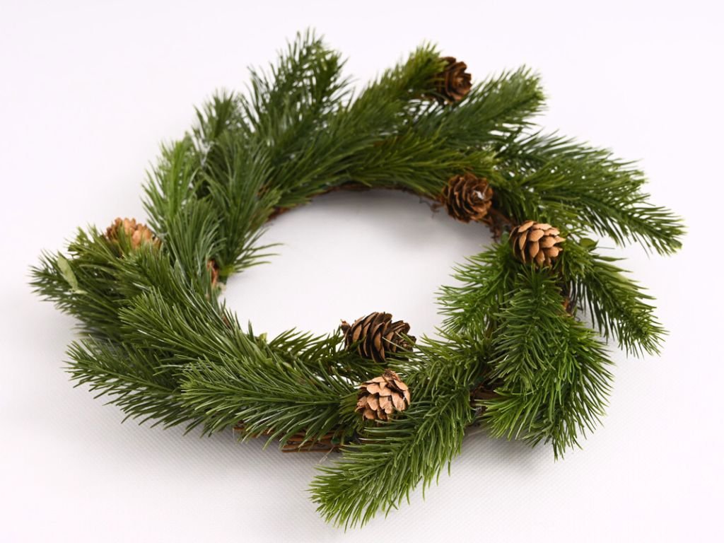 Vytvorte si hneď pri vchode pravú zimnú atmosféru. Tento elegantný ihličnatý veniec je aranžovaný do pravidelného kruhu na pevnom prútenom základe a ozdobený drobnými šiškami v prirodzene hnedých tónoch. Husté, sýtozelené vetvičky pôsobia sviežo a realisticky, pekne prekryjú základ a dávajú vencu objem bez zbytočnej „nafúknutosti“. Priemer 30 cm je univerzálna veľkosť – pôsobí upravene na dverách, ale výborne sa hodí aj ako stred stola s kancelou či sviečkou.